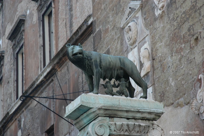 Die kapitolinische Wölfin mit Romulus und Remus vor dem Senatorenpalast