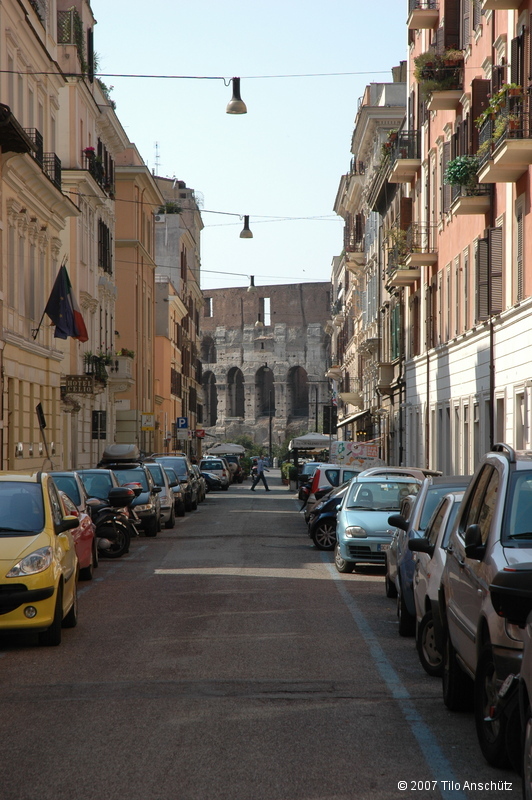 Blick durch die Via Serpenti (in der unser Hotel lag) auf das Colloseum